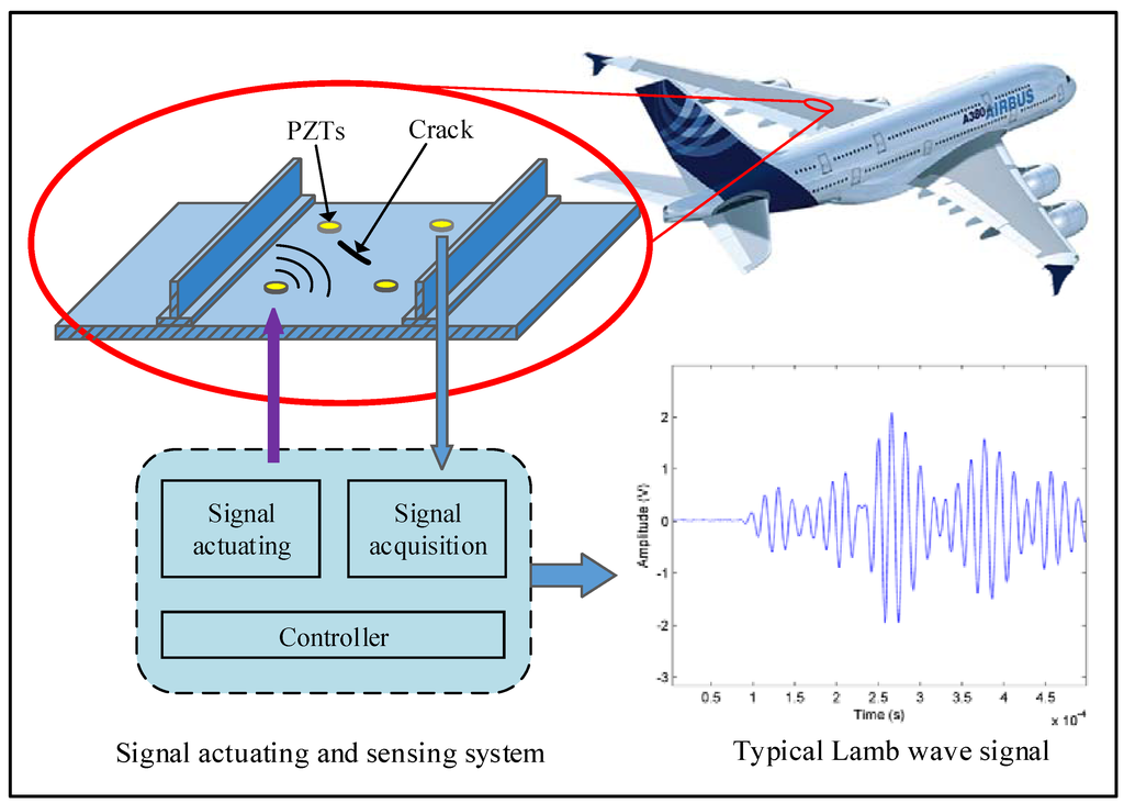 The PZT sensor array is arranged on the structure. After the Lamb wave is excited in the structure by a PZT, interaction of the Lamb wave with the crack can influence the Lamb wave propagation. By comparing the received signals under healthy and cracked conditions from other PZTs, the crack can be estimated.