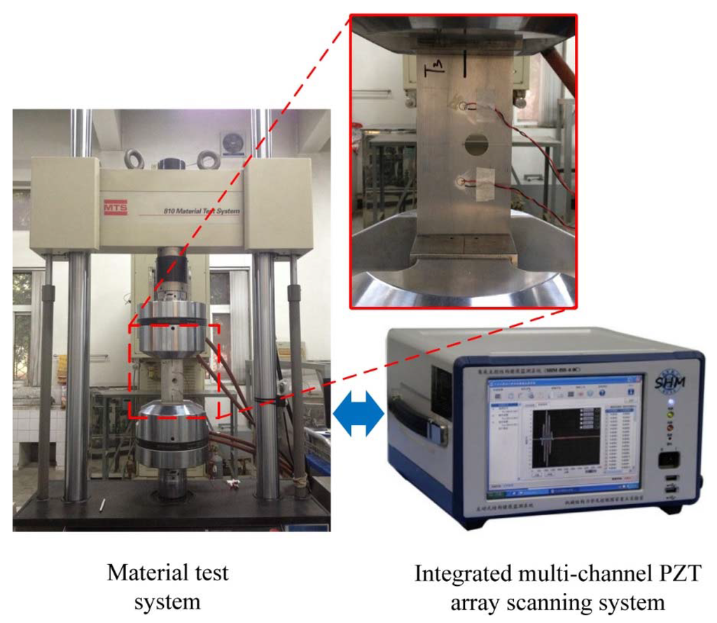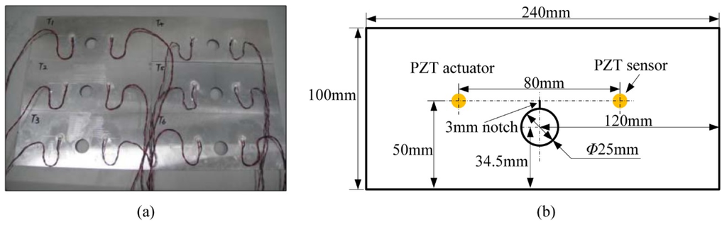 Table 1 lists their mechanical properties. For each specimen, a 3 mm notch was machined at the edge of the through hole to initiate the crack and control the crack propagation direction during the fatigue test. Two PZTs were attached to the specimen and used as the actuator and the sensor respectively, whose positions are illustrated in Figure 6b.