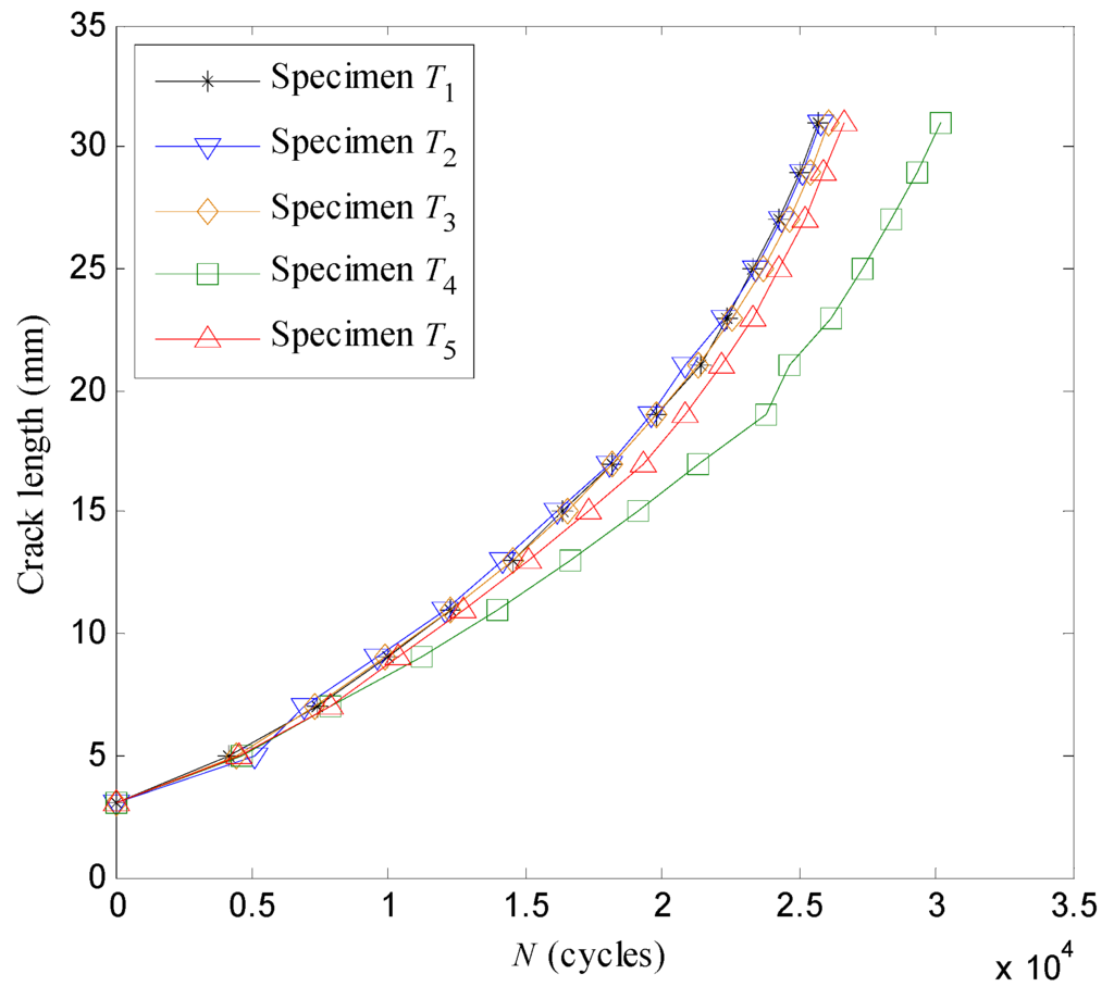 As illustrated in Figure 9, the fatigue crack propagation results of the specimens T1–T5 are recorded at 2 mm crack length intervals.