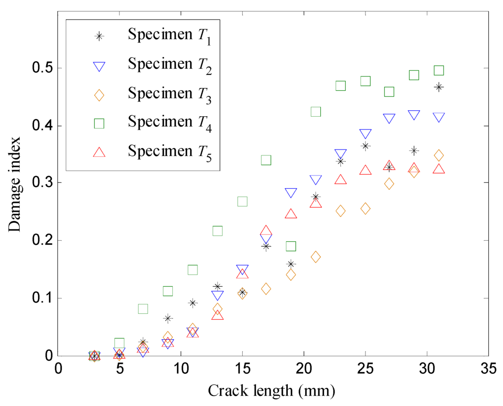 Obvious uncertainties can be seen in the results. The corresponding damage indices are presented in Figure 10. It can be observed that the damage indices of each specimen are capable of representing the crack propagation process, and likewise measurement uncertainty exists.