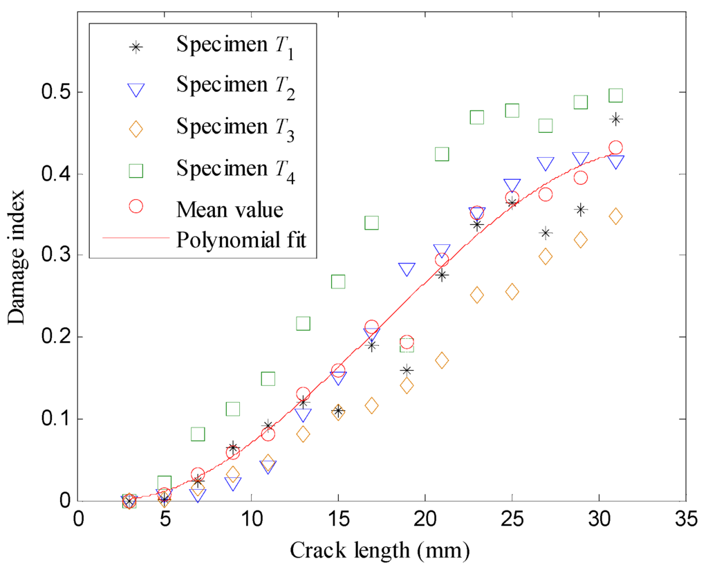 After that, a third order polynomial as shown in Equation (15) is employed to govern the relationship between the crack length and the mean value of the damage indices: