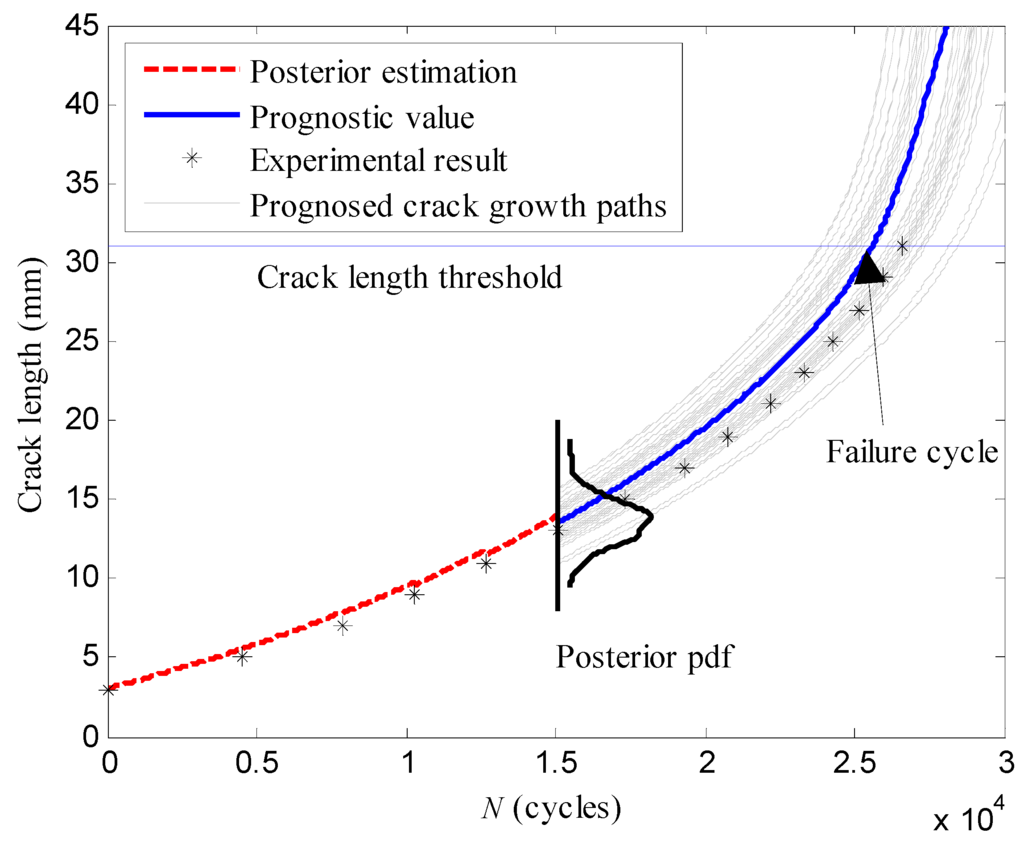 As illustrated in Figure 5, the flow chart shows the process to obtain the crack propagation prognosis and the estimation of the failure cycle based on the obtained posterior pdf.