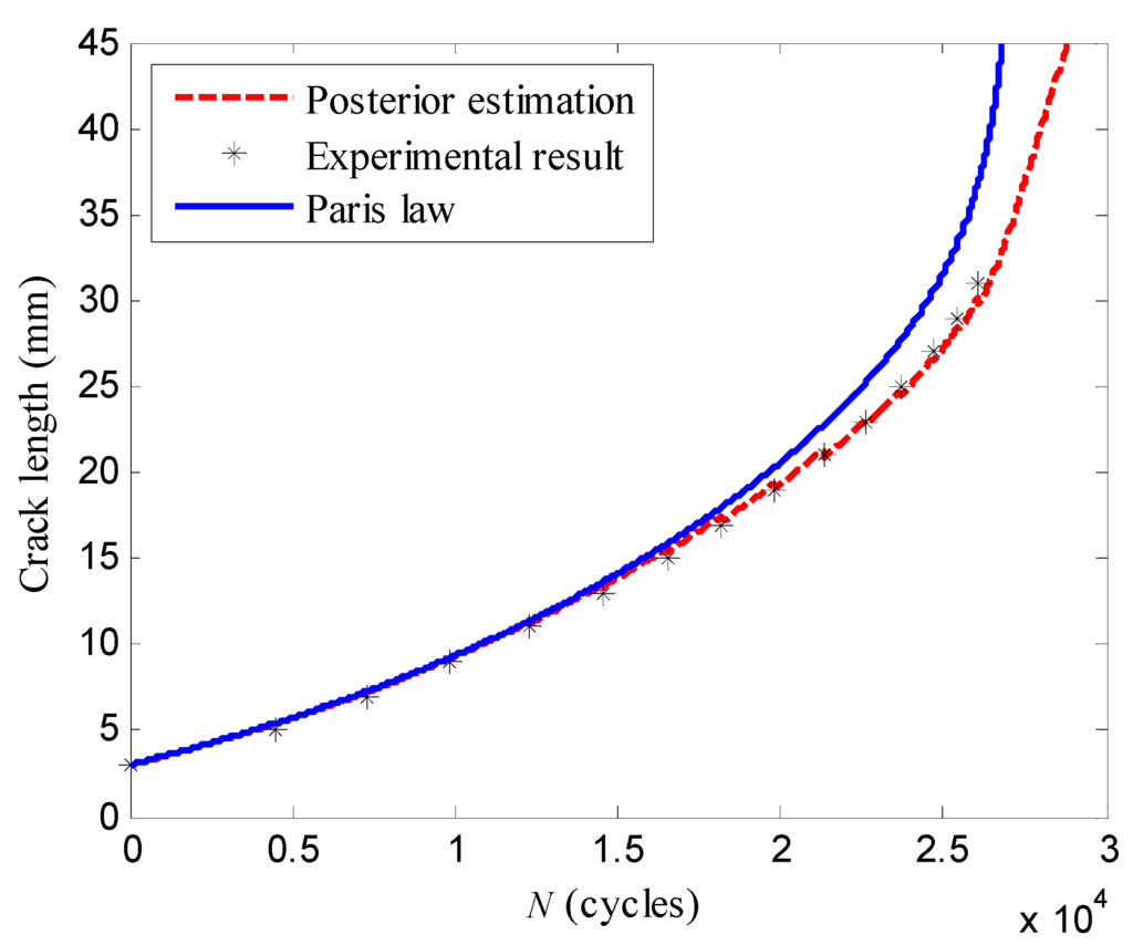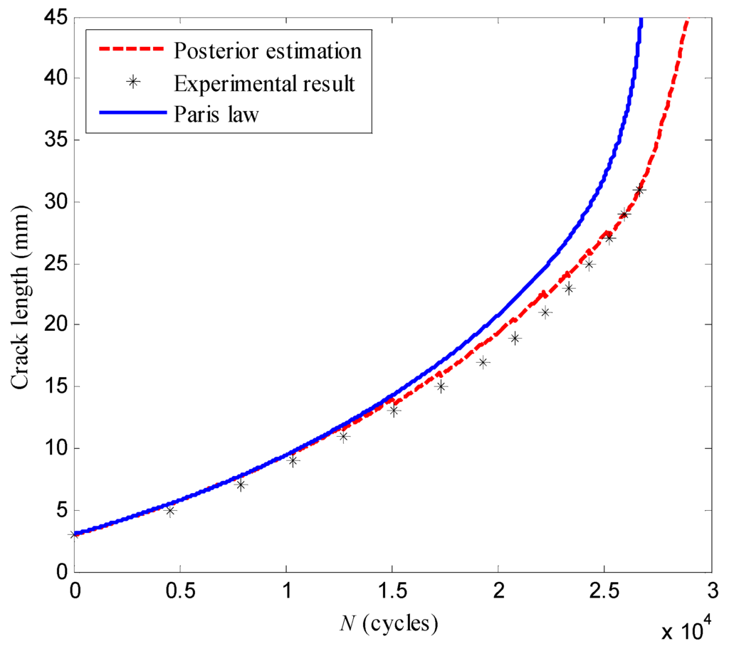 The particle number and the resampling threshold of the PF algorithm was set to , respectively. The loading cycle step was chosen as ΔN = 50 cycles. The initial crack length is 3 mm. The random samples from the distribution were adopted as the initial particles to obtain a diverse particle set. When the crack length exceeds the predefined threshold , the structure is considered to be in a very critical state where the crack tip is close to the structure boundary, and is defined as structural failure.