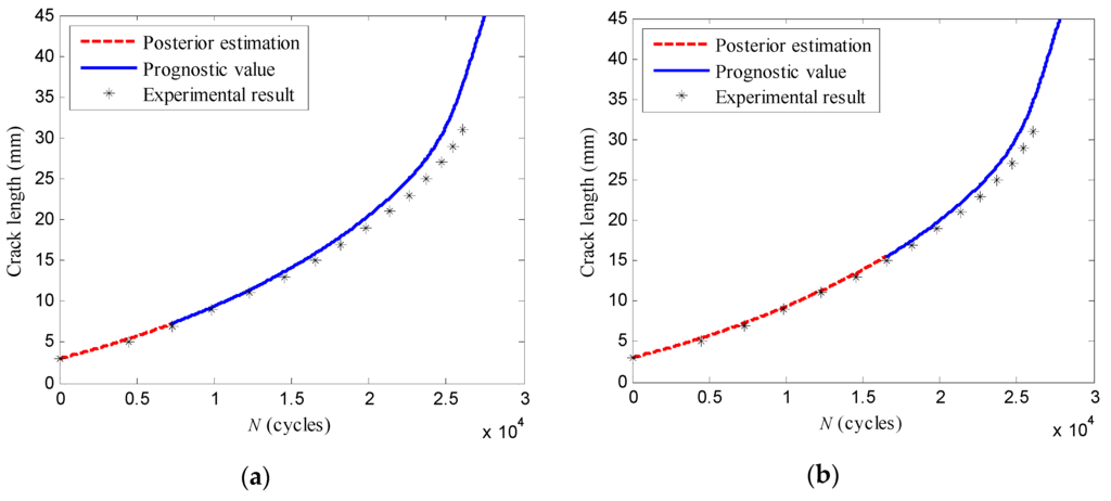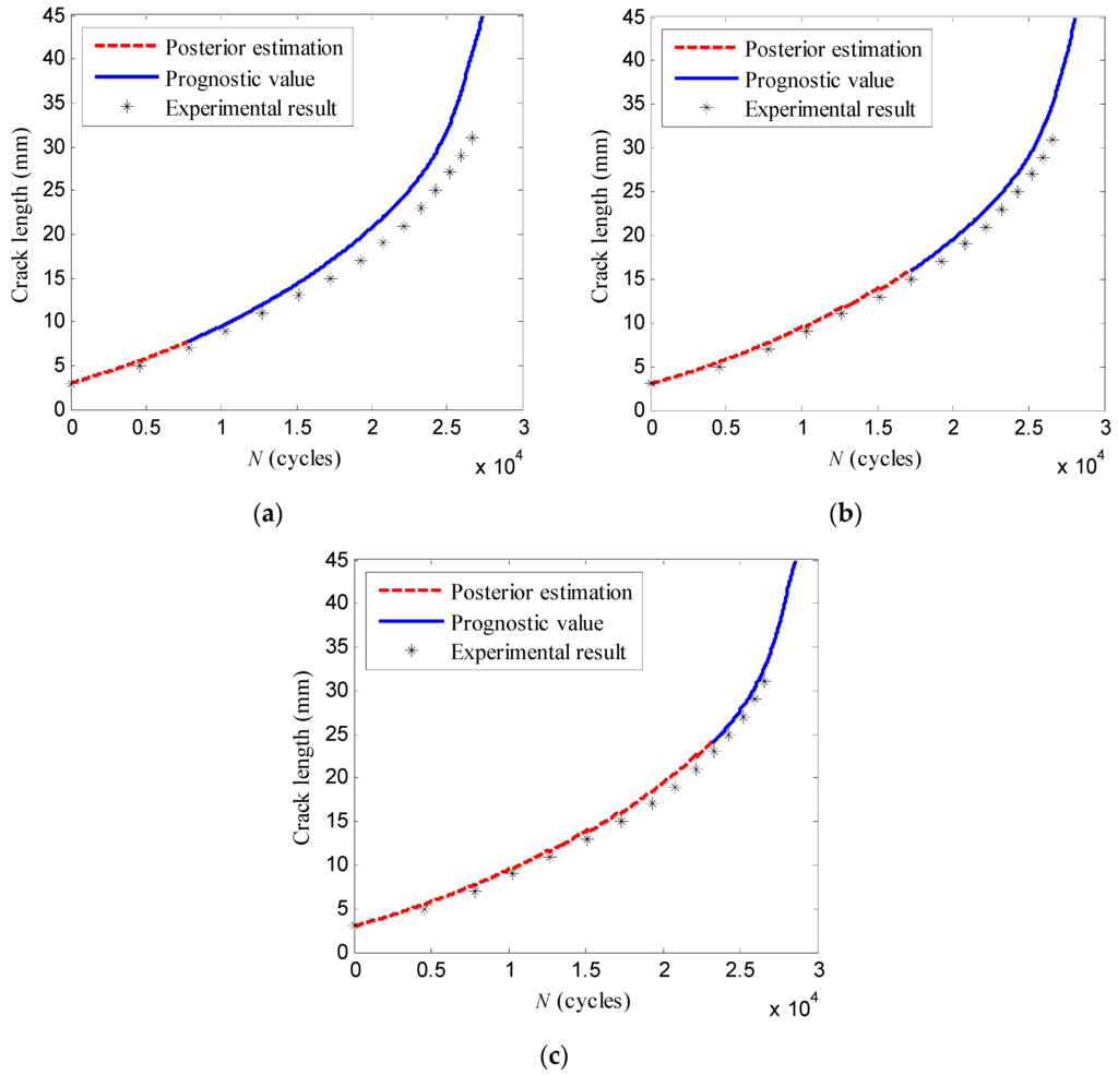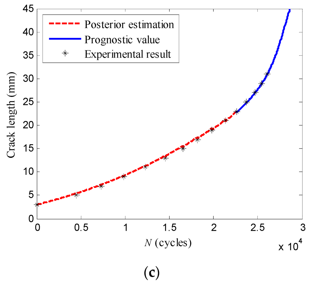 After that, the prognostic result of the crack length can be evaluated as Equation (35):