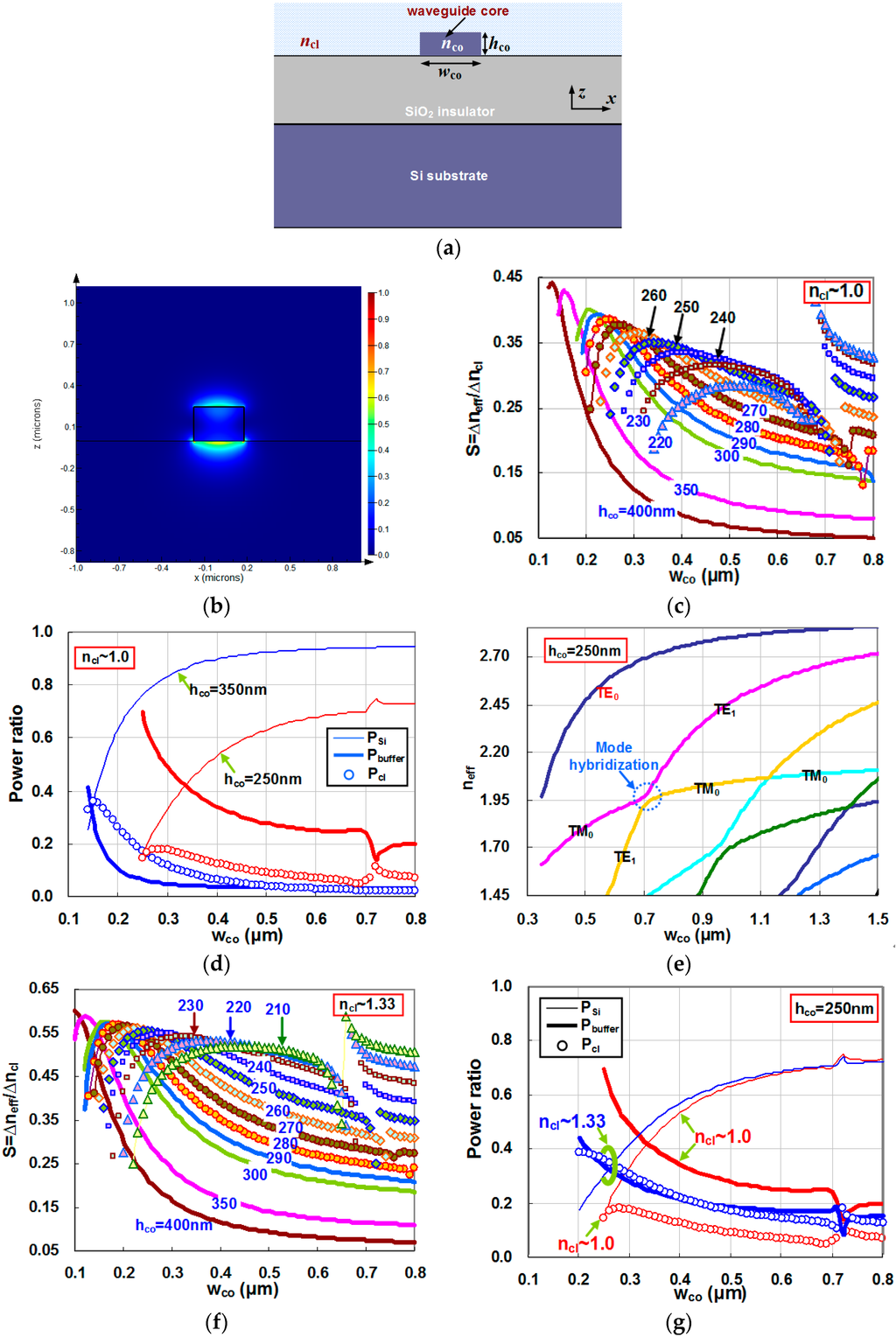 (a) The cross section of a suspended Si nanowire; (b) the calculated field distribution of the TM fundamental mode for a suspended Si nanowire waveguide with hco = 220 nm, wco = 525 nm, and ncl = 1.0; (c) the sensitivity of a suspended Si nanowire for gas sensing (ncl ~ 1.0); (d) the power confinement ratio in a suspended Si nanowire for gas sensing; (e) the calculated sensitivities for a suspended Si nanowire with wco = 0.8 μm and wco = ∞ (slab waveguide); (f) the sensitivity of a suspended Si nanowire for liquid sensing (ncl ~ 1.33); and (g) the power confinement ratio in a suspended Si nanowire for liquid sensing.