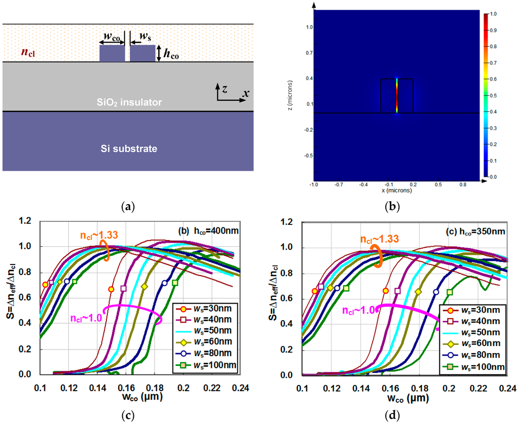 An SOI nanoslot waveguide consists of two Si regions with a nanoslot between them, as shown in Figure 2a. Figure 2b shows the calculated field distribution of the TE fundamental mode for a SOI nanoslot waveguide with hco = 400 nm, wco = 180 nm, and ws = 30 nm as an example. It can be seen that there is a significant field enhancement in the nanoslot region. This field enhancement makes it very attractive for optical sensing when the sample to be measured fills the whole region of upper-cladding (including the nanoslot region).