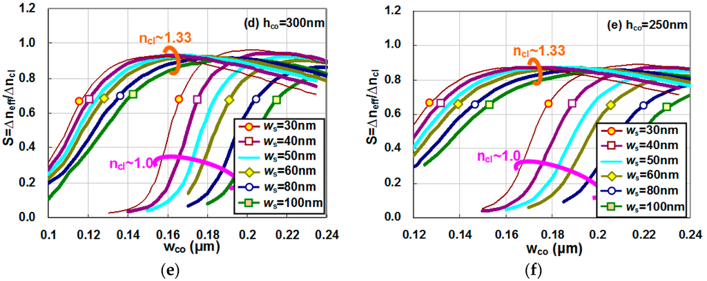 Figure 2c–f show the calculated waveguide sensitivity for gas sensing as well as liquid sensing as the core width wco varies for the cases of hco = 400, 350, 300, and 250 nm, respectively.The nanoslot width is chosen as 100, 80, 60, 50, 40, and 30 nm for any given core height hco. In Figure 2c–f, it can be seen that the sensitivity of a nanoslot waveguide is similar for different values of hco when it is covered by gas or liquid. For a nanoslot waveguide with a given slot width ws and core height hco, the sensitivity increases rapidly and then decreases slightly as the core width varies in the range from 0.12 μm to 0.24 μm. It can be seen that there exists an optimal core width wopt for obtaining a maximal sensitivity Smax for both cases based on claddings of gas and liquids.