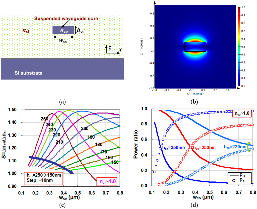 In this part, we give an analysis for a suspended Si nanowire, which includes a Si core surrounded by the sample, as shown in Figure 3a. Such a suspended waveguide could be achieved with supported arms [21,22]. Figure 3b shows the calculated field distribution of the TM fundamental mode for a suspended Si nanowire waveguide with hco = 220 nm, wco = 525 nm, and ncl = 1.0 as an example. Figure 3c shows the calculated sensitivity for a suspended Si nanowire with different core heights hco as the core width varies from 0.1 μm to 0.8 μm. From this figure, it can be seen that the sensitivity is slightly higher than 1.0 (i.e., the sensitivity of free space) when the core height is small (e.g., 150 nm). This is because the power confined in the Si core is very small while most power of the guided mode locates at the surrounded media, which is very similar to the free space case.