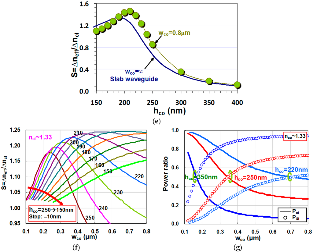 When the core height becomes larger, a significant sensitivity enhancement is observed. For a suspended Si nanowire with a fixed core height (e.g., hco = 100 ~ 200 nm), the sensitivity increases monotonously when the core width ranges from 0.1 μm to 0.8 μm. When increasing the core height further (e.g., hco = 250, 240, 230, 220, and 210 nm), one sees that in the range of 0.1 μm < wco < 0.8 μm there exists an optimal core width wco_opt (which gives a maximal sensitivity Smax of >1.0).