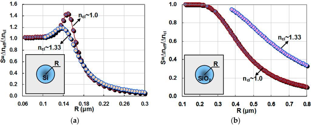 The sensitivity for a nanofiber with: (a) Si core; and (b) SiO2 core.