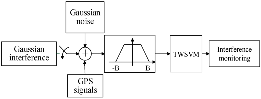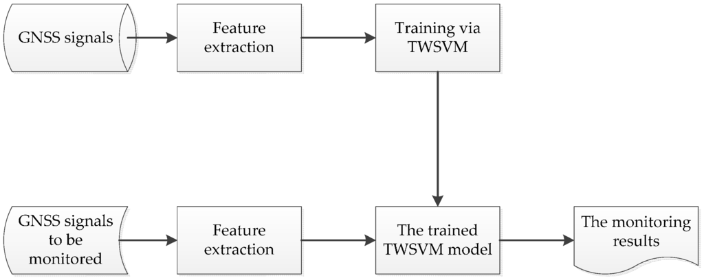 The process of the interference monitoring based on TWSVM is shown in Figure 1. Firstly, the training samples are extracted from GNSS signals and then imported into the TWSVM to get TWSVM model; secondly the corresponding characteristic parameters are extracted from GNSS signals to be monitored, and then imported into the trained TWSVM model to get the monitoring results.