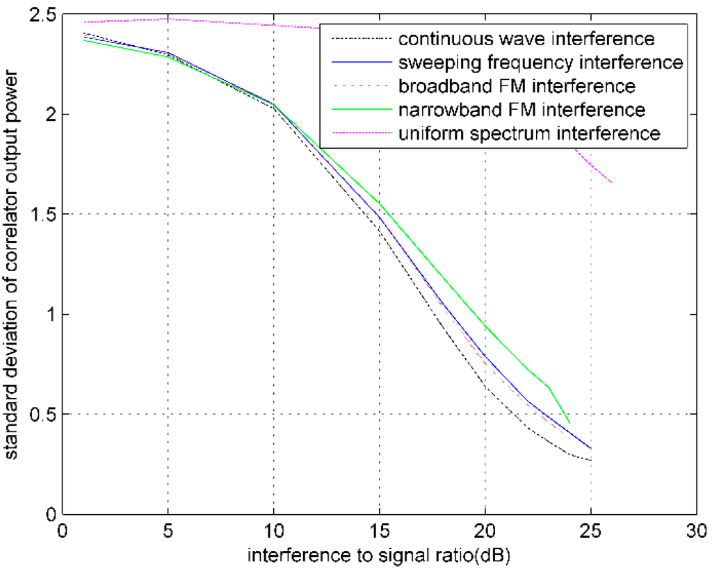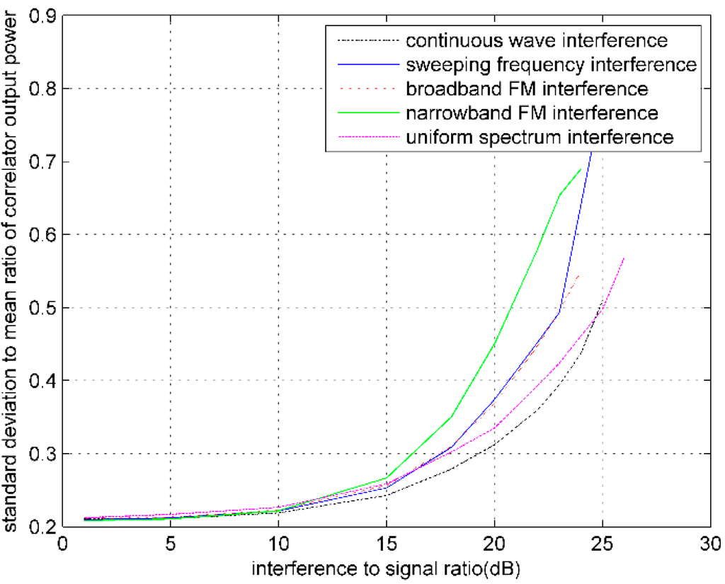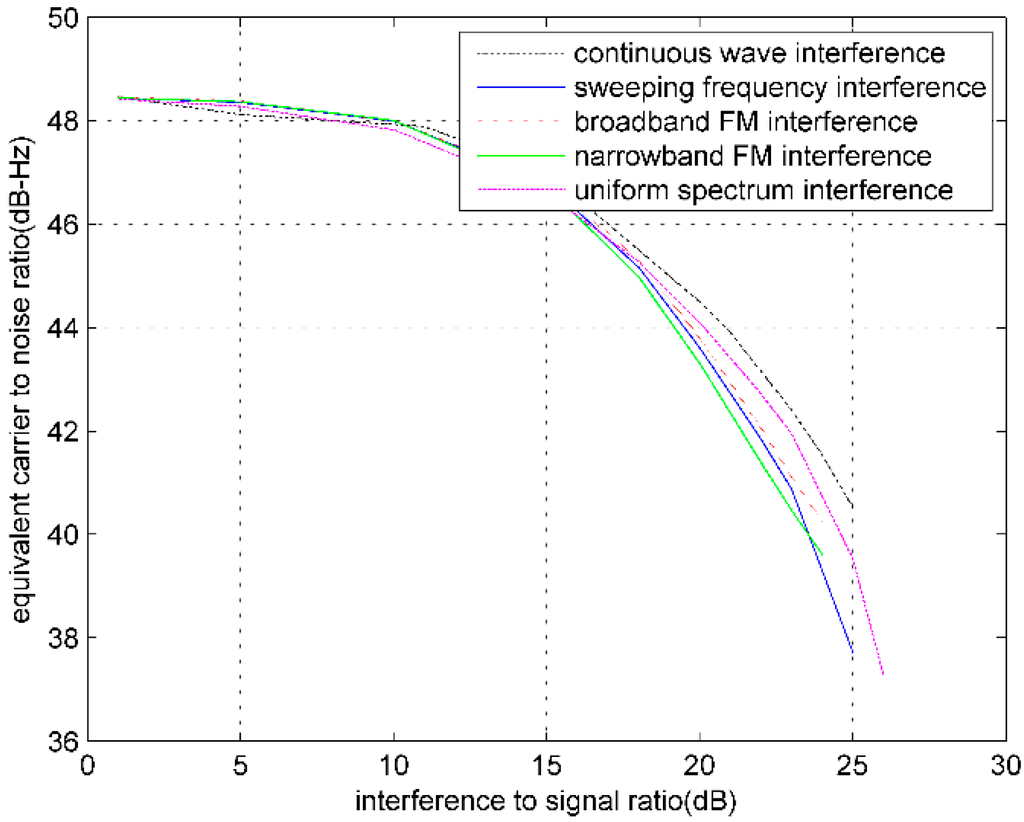 When noise and RFIs are superimposed on the GPS digital intermediate frequency signal, with different RFIs and the increase of interference signal power, the output of GPS software receiver will change. Figure 3 shows the curves that express the relation between the equivalent and the interference to signal ratio (ISR), respectively, under conditions of continuous wave (CW) interference, broadband FM interference, narrowband FM interference, sweeping frequency CW interference, and uniform spectrum interference for the PRN3 satellite.