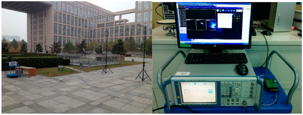 To demonstrate the results discussed in the previous sections, three experiments were designed. The hardware setup for the experiments is shown in Figure 7. As can be seen the software receiver is used to capture the IF data to be analyzed and a SMU200A Vector Signal Generator (Rohde & Schwarz GmbH & Co. KG, Munich, Germany) is used to generate the broadband and narrowband interferences. The interferences are transmitted by a G5Ant-52PT1 transmitting antenna (Antcom corporation, Torrance, CA, USA) which are combined with the real GPS signal received by a HX-BS781A antenna (Harxon corporation, Shenzhen, China).