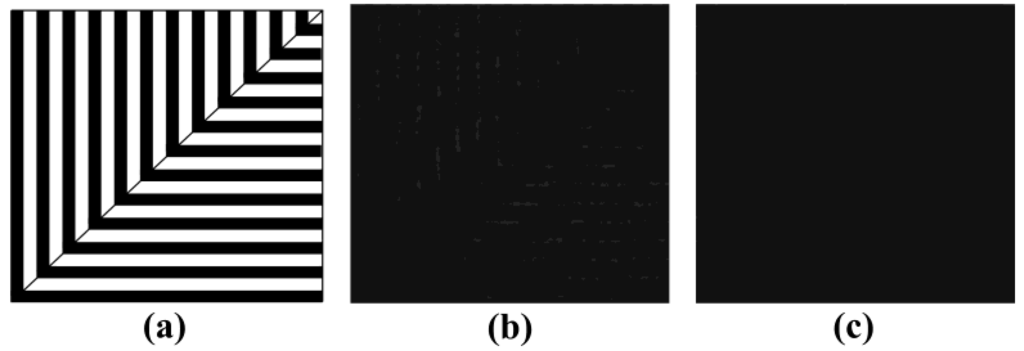 As we all know, a geometric moiré fringe pattern will appear when two similar grating strips with slope angle are superimposed. In our experiments, we had designed a calibration periodic grating pattern to analyze the x and y directional phases of the moiré fringe pattern simultaneously, as shown in Figure 3a. Each periodic grating pattern consists of four mirrors, two on and two off. Similarly, the pixels of CCD camera with every four pixels as one period are equal interval sampled. Then the first pixel in each period is selected as pixel sampling value and duplicated it to another three pixels to make all the pixels with the same value in each period. The initial result of correspondence of DMD-to-CCD is shown in Figure 3b, and the phase-shift moiré fringe phenomenon appears. The reason is that when the DMD and CCD are not corresponding, due to the sampling pixel values of neighboring periods are different, the grayscales of periodic stripe pattern are changed gradually and the moiré fringe can be easily observed after replication and interpolation. However, when each mirror of DMD and each pixel of CCD are corresponding, the image captured by CCD camera will not show a stripe pattern since all the pixels have the same value in each period. Therefore, the correspondence of DMD-to-CCD can be detected with high accuracy by using the presence or absence of moiré fringe pattern.