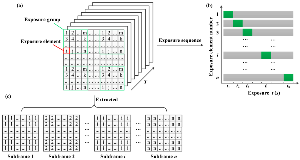 Individual mirrors on DMD plane are classified for programming purposes as being part of exposure elements, exposure groups, and subframe elements as shown in Figure 4a. Here, each DMD coded pattern can be taken as a mask. Suppose we subdivide a DMD mask into m non-overlapping exposure groups, each exposure group consists of n exposure elements. Each exposure element has the different identifiers in every exposure group but with the same identifier in all exposure groups. Figure 4b shows the individual exposure elements with same identifier are simultaneously exposed, and the exposure elements with different identifiers are sequentially exposed during one frame integration time of the CCD camera. So that at any instant, the grayscale of corresponding pixels in image sensor are different because of different exposure time. That is, the temporal information has been embedded in each frame by per-pixel coded exposure. The coded exposure images with full-resolution are read out and stored after one frame integration time of the CCD camera. In addition, n subframes can be extracted from the resulting coded exposure image in all m exposure groups based on the different light intensity distribution of the image. Then, pixels labeled as 1 in all exposure groups are extracted to constitute subframe 1 and pixels labeled as 2 in all exposure groups are extracted to constitute subframe 2, and so on, until the composition of the subframe n as shown in Figure 4c. Therefore, the coded exposure images with the full-resolution are unchanged at native detector frame and the spatial resolution of each subframe is n times lower than that of the coded exposure image, but the temporal resolution of the DMD camera can be greatly improved by n times higher than the conventional image-capture mode of the same detector. Thus, the per-pixel coded exposure for high-speed and high-resolution imaging by using a DMD camera can be implemented without increasing the inherent properties of camera.
