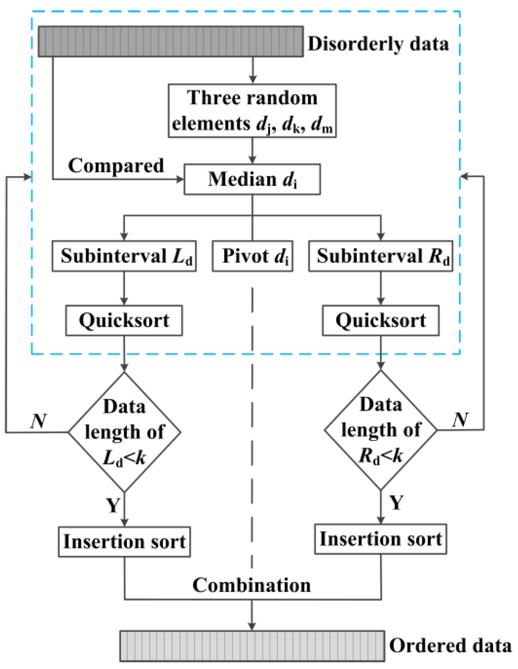 Figure 7 shows the flowchart of three-element median quicksort method. After that, an ascending sequence of data will be available. In order to obtain the reasonable value of k, we need to calculate the time complexity of the new algorithm. The average time complexity of traditional quicksort can be expressed as