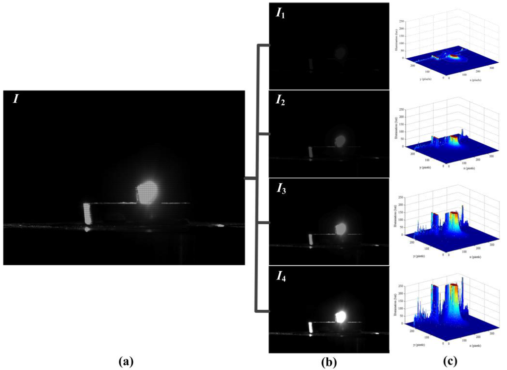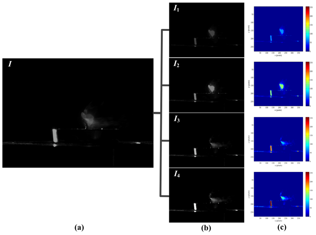 The second example result of coded exposure for the motion of the candles flame. (a) Coded exposure image I; (b) Subframes: I1, I2, I3, I4; (c) Light intensity distribution of candle flame.