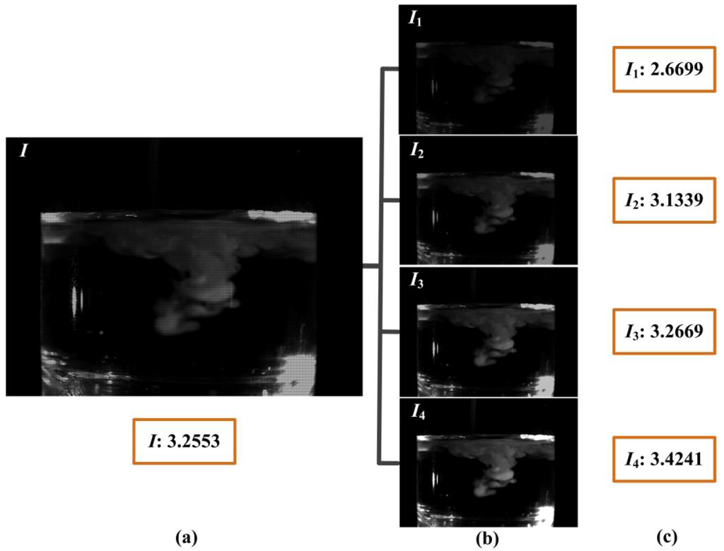 The third example result of coded exposure for subtle change of the liquid mixing motion. (a) Coded exposure image I; (b) Subframes: I1, I2, I3, I4; (c) Entropy of different frames.