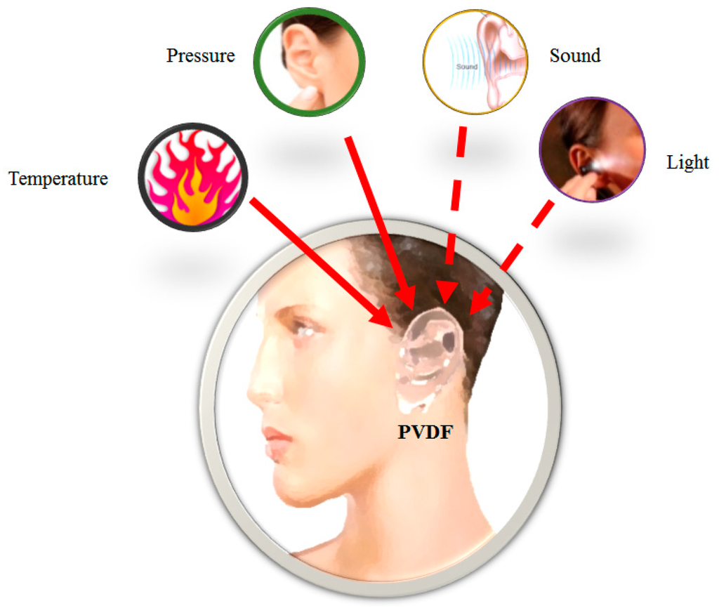 PVDF is polymorphic and has a crystalline phase (ß-phase). The ß-phase is the most relevant phase for practical ferroelectric, piezoelectric and pyroelectric applications. PVDF belongs to a non-centrosymmetric class, which is responsible for its piezoelectric properties. The ear prosthesis made of piezoelectric PVDF is preferred, because the processes commonly used to obtain piezoelectric and pyroelectric properties of PVDF in the ß-phase are achieved by applying a high voltage of at least 0.5 MV/cm, or by using plasma or corona poling [7].