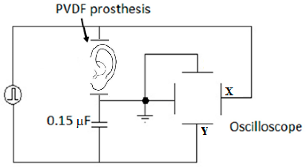 In order to measure the ferroelectric hysteresis loop, the Sawyer-Tower circuit was implemented in this study (Figure 2). By measuring the voltage () across a capacitor () in series with the PVDF prosthesis (), the charge on the ferroelectric can be determined, since: . A sine wave was applied to the circuit with a function generator, Rigol Model DG4062; the X channel was measured from an X-Y trace using an oscilloscope, Tektronix Model MSO 3014.