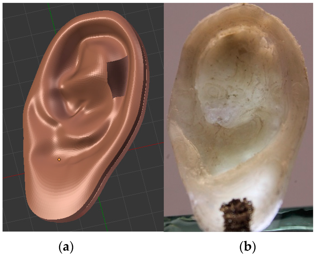Figure 5a shows the design of a 3D human ear model according to the anthropometric parameters [14,15,16] and created with a computer aided design (CAD) software. It was exported as a stereolithography file in order to print it using a 3D printer.