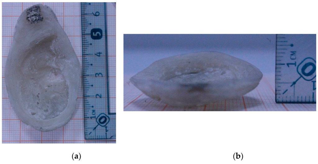 Dimensions of the ear prosthesis printed from PVDF. (a) Top view of the prosthesis, (b) Side view of the prosthesis.