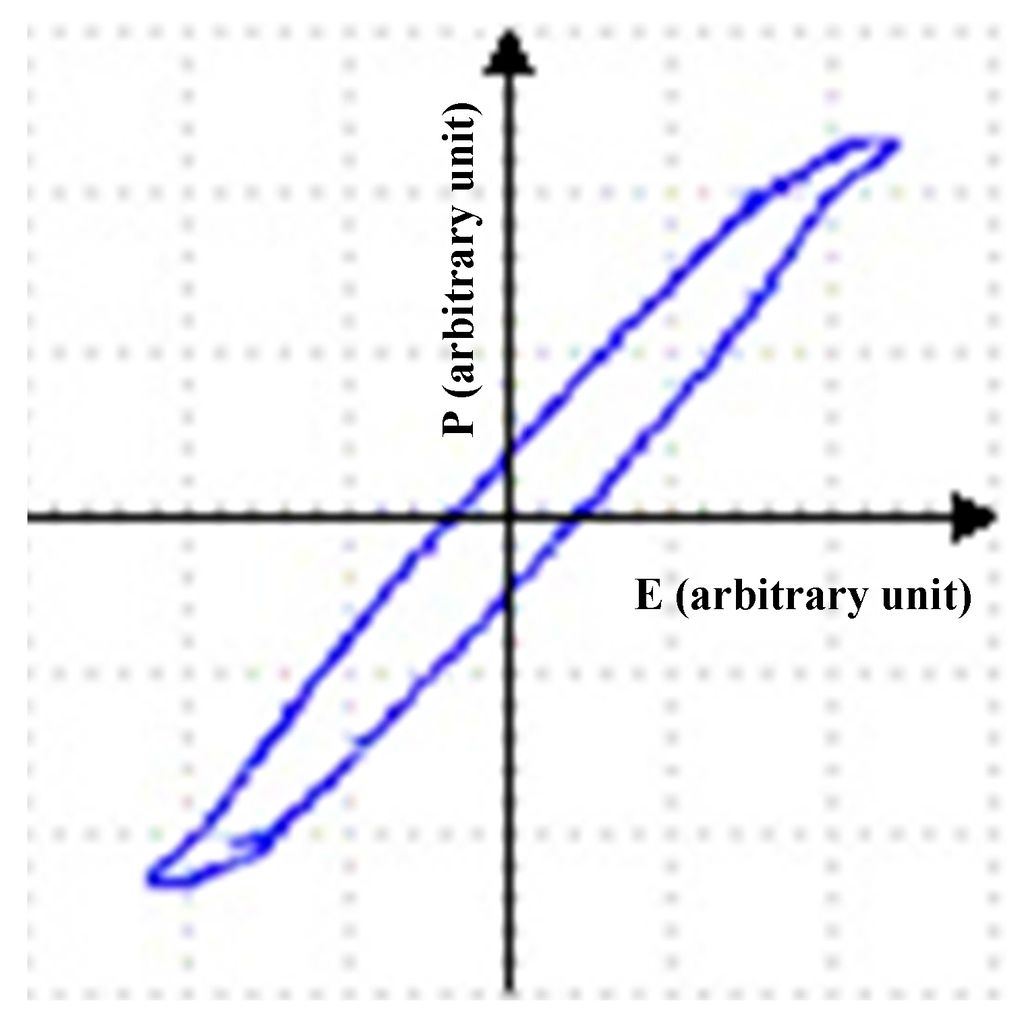 The Sawyer-Tower circuit (Figure 2) was used to measure the ferroelectric properties, such as hysteresis. Figure 7 shows the P-E hysteresis loop of the printed PVDF; the X-axis shows the electric field (E) in kV/cm and the Y-axis polarization (P) in μC/cm2; where P and E are arbitrary units.