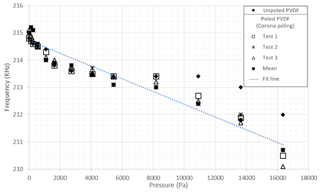 Equation (4) fits a line through the points at 0 Pa to 16,350 Pa for the poled PVDF prosthesis with a correlation coefficient of 0.9670.