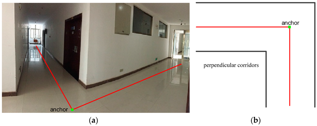 A conventional building with regular structure means that its corridors are either parallel or perpendicular to each other. Although some large buildings such as libraries or malls do not have such rectangular structures, they still have Perpendicular Intersectant Corridors (PICs). Figure 2a is an example of the real-scenario PICs, where the two corridors are perpendicular to each other and have an intersecting point. Figure 2b is the floorplan of the PIC. In our implementation, anchors are defined based on such structures. The two red lines lie in the middle of the corridors respectively, and their intersecting point is defined as an anchor.