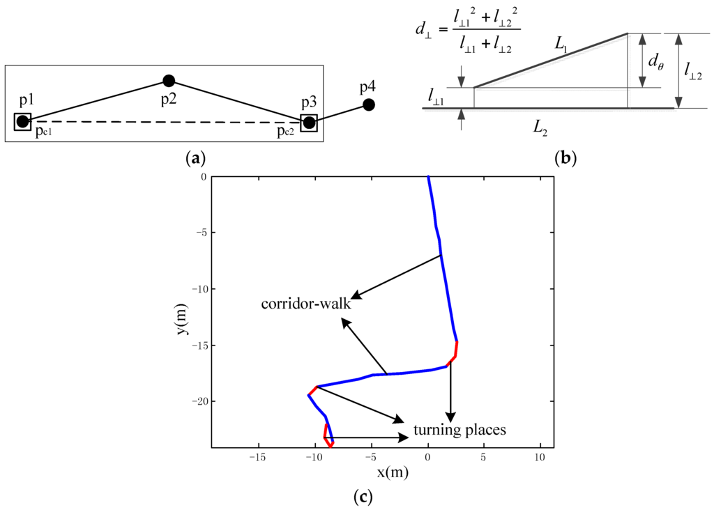 Figure 3c is a real-scenario partitioning result of a pedestrian’s trajectory. To better demonstrate the result, adjacent partitioned segments are shown in different colors (red and blue). Because this scheme partitions trajectory according to its similarity to a straight line, when there are obvious turning places, the previous segment ends and a new segment starts, thereby decreasing . On the other hand, increases with the number of trajectory partitions. Therefore, the minimizing scheme of the sum of and in Equation (2) can be intuitively regarded as partitioning trajectory into segments of straight lines, while keeping the numbers of partitions low. It thus follows that if a long straight-line segment is extracted, it can be regarded as a corridor-walk.