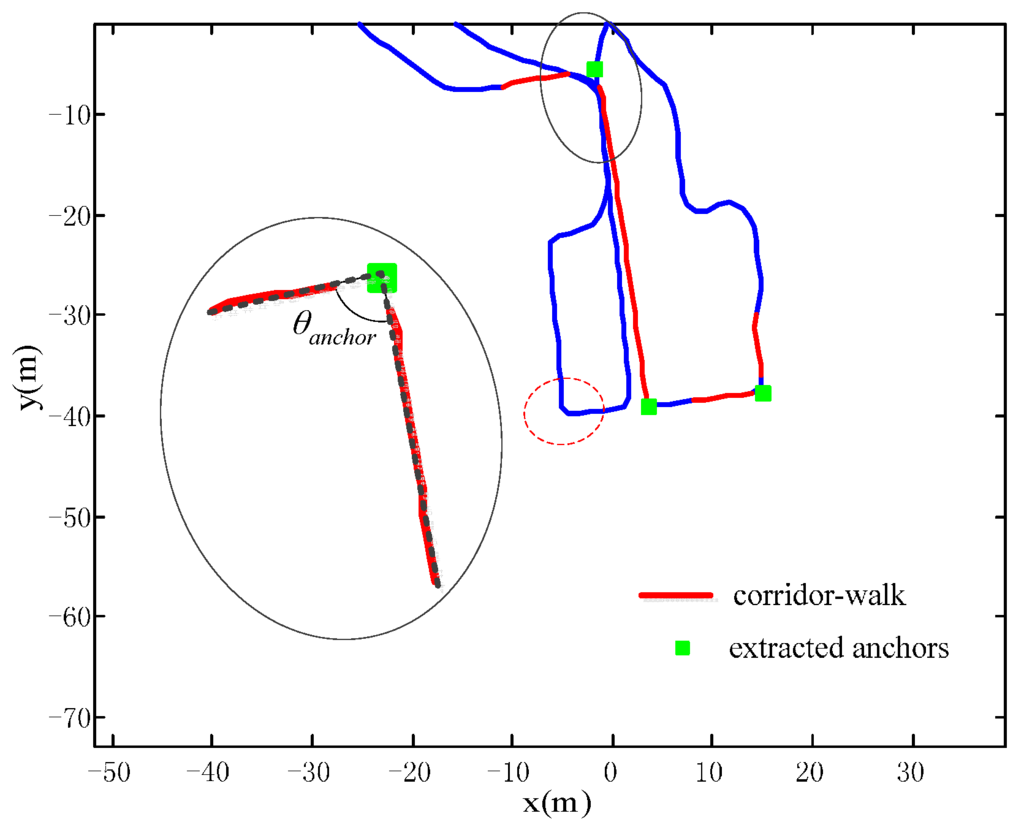 Without any additional sensors, anchors cannot be observed directly. However, virtual or observed anchors can be extracted from trajectories, and they can be considered as an observation of the real anchor with observation noise. Only with observations can an RBPF be used to solve the joint estimation of positions (trajectory) and maps (anchors) problem. The extraction or “observation” of anchors from the trajectory follows two steps: trajectory segmentation and anchor extraction from corridor-walks.