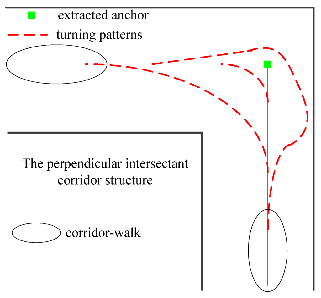 Extracting anchors in this manner has two advantages. The extracted anchors have strong similarities to the real ones. Because the extracted anchors are the intersecting points of the extension lines of adjacent corridor walks, they can represent the building structure, i.e., the anchors do not vary with the pedestrian’s walking behaviors. As shown in Figure 5, no matter how the pedestrian takes a turn (dashed red), the extension lines of the corridor-walks (in the ellipses) intersect at the extracted anchor (green square).