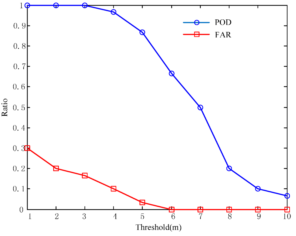 As the proposed method adopts anchors to reduce positioning errors, it is important that the anchors are extracted correctly. Since correct anchor extraction is based on reliable identification of corridor-walks, close attention should be paid to it. We already have the general criterion for the identification of corridor-walks: If the length of the partitioned line segment is over a threshold, it can be regarded as a corridor-walk. However, how to choose the threshold remains a problem. Here we estimate the threshold based on two principles: the Probability of Detection (POD) should be as large as possible to make sure there are enough anchors in the SALM framework; the False Alarm Rate (FAR) should be as low as possible to increase the robustness of anchor detection. Figure 6 are the POD and FAR curves against the threshold of length of corridor-walks. The data set used here is a trajectory generated from a 30-min walk in a typical office building, where the true number of anchors can be acquired manually. From Figure 6, we can see that the two principles are in fact contradictory, because POD and FAR have positive correlations. We set the threshold at 5 m to reach a compromise, where POD is fairly high while the FAR is fairly low to make sure anchor detection is robust.