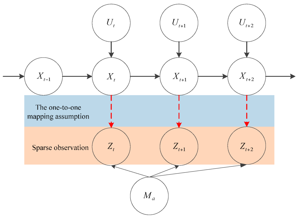 - Calculate the Kalman gain in Equation (10), where , and are defined in Equation (9).