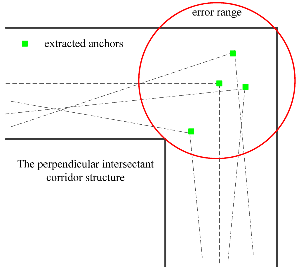 As illustrated previously, the anchors to be extracted from trajectories are not the intersecting points of the PIC structure in Figure 2b. They are “observations” of these points and are called virtual anchors, which have a one-to-one mapping relationship with real ones. They should have strong similarity to real anchors. An example of anchor extraction is shown in Figure 4. In the figure, three anchors are extracted from four corridor-walks (red segment), where the corridor-walks are identified through the trajectory segmentation scheme in Section 2.2.1. Please note that no anchors are extracted in the red dashed circle, because the partitioned line segments are not long enough to be deemed corridor-walks. Now we magnify the upper anchor for detail description. The anchor is extracted as the intersecting point of the extension lines (black dotted) of adjacent corridor-walks (red line segments). In addition, the adjacent corridor-walks should be very close to 90 degrees, to ensure the matching of virtual anchors and real ones. This condition is expressed in Equation (3), where denotes the angle between adjacent corridor-walks, and denotes the error tolerance from a right angle.