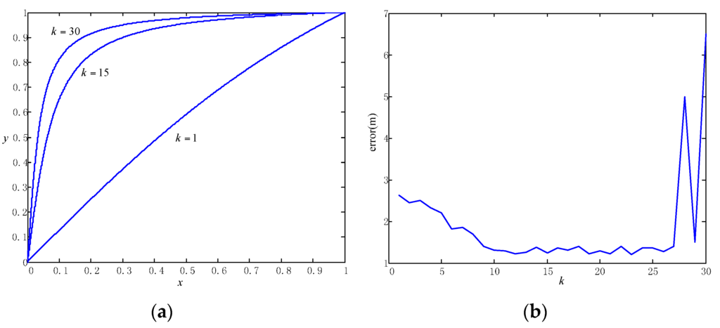 (a) The different values for the parameter in the rewarding function correspond to different extents of convex; (b) the curve of positioning errors against different values of .