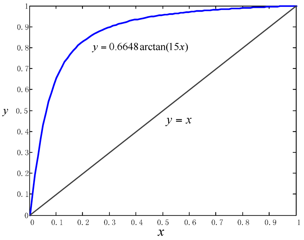 Overall, we chose the function as shown in Figure 10, where equals 15 according to the curve of Figure 9a and the normalizer equals 0.6648 to make sure the rewarding function crosses the point (1,1). After the weighting process, the particles are resampled [22] to eliminate particles with small importance weights and duplicate particles with significant weights. Then the current position of the pedestrian is estimated with the average position of the largest group of particles with the same data association.
