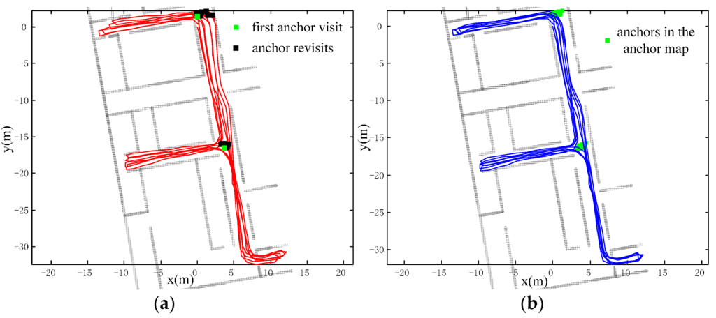 The experiment has a total walking distance of about 995 m. The trajectories are compared in Figure 15 and the positioning errors are compared in Table 2. Our method has the best consistency and has lowered the error from about 2.0 m to 0.3 m, with the percentage of error relative to the distance traveled from 0.2% to 0.03%. The HAH method relies heavily on pre-defined directions, so that some sub-trajectories’ headings are falsely calibrated, especially in the areas where the trajectories are curves. Therefore, the error of HAH reaches up to about 7.5 m, even more than the error of the raw trajectory. This experiment can also demonstrate the robustness of our method. Figure 16 shows the raw trajectory and the extracted anchors (green ones denote first visited anchors; black ones denote their association with previous anchors). As we can see, the extracted anchors are intensive and the method sometimes has an incorrect anchor association. Because the pedestrian deliberately crossed the anchors with the ranges of a book shelf during the library walk, the extracted anchors are very close to each other and can lead to wrong anchor association. However, as the anchor association is based on a per-particle basis, partial wrong data association will not greatly affect the overall accuracy. In other words, this method is robust enough to cope with the intensive anchor situation, where wrong anchor association is unavoidable.