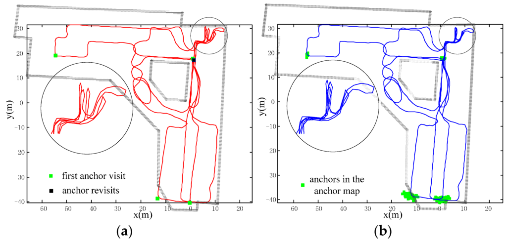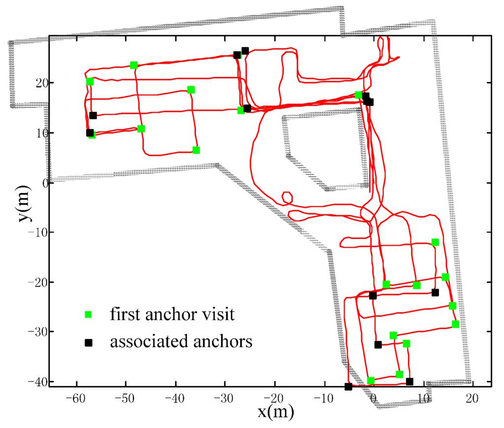 From the perspective of the probabilistic description, the filtering is to estimate the posterior density , where is the horizontal position vector of the pedestrian, denotes the anchor map, is the observation, is the driven vector for the pedestrian, and the suffix indicates the th step. Note that the filtering is step-wise, because the positions of the pedestrian are updated each time the pedestrian takes a step in the human motion model. If we ignore the anchor-involved states like and , the posterior becomes and it is the motion model. Therefore, if no anchors are defined or used, the filtering results degenerate to the raw trajectory. To increase the location accuracy, we have merged the anchor-involved states and into the probabilistic model. On the surface, it seems that the redundant elements in the probabilistic model have increased the complexity of the filtering by adding the dimensions of state space to be estimated. However, if loop-closure happens and the anchors are correctly associated, i.e., the anchors in the anchor map are re-observed, the correlation between the anchors would become increased and the joint probability density on all anchors would become peaked [21]. Note that the position vector is also correlated to the anchor map, so the uncertainty for the position estimation is diminished and the accuracy increased.