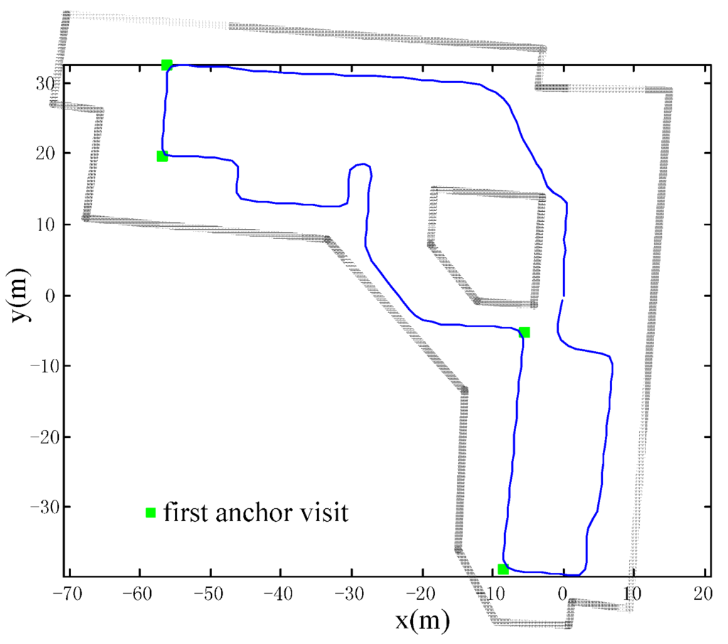 - A library scenario with no anchor revisits. Without any revisits of anchors, the positioning error cannot be calibrated. The accuracy will degenerate to raw trajectory as shown in Figure 14. The raw trajectory and the calibrated one coincide with each other (the blue trajectory). The results of this test may be obvious according to the principle of our approach; however, we still need the test to confirm the superiority over other domain direction assumption-based approaches, which will lead to positioning failure if the assumption does not stand.