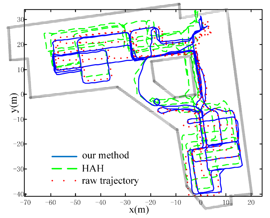 Trajectories for our method, the HAH method and raw trajectory. Our method has better accuracy than HAH and raw trajectory.