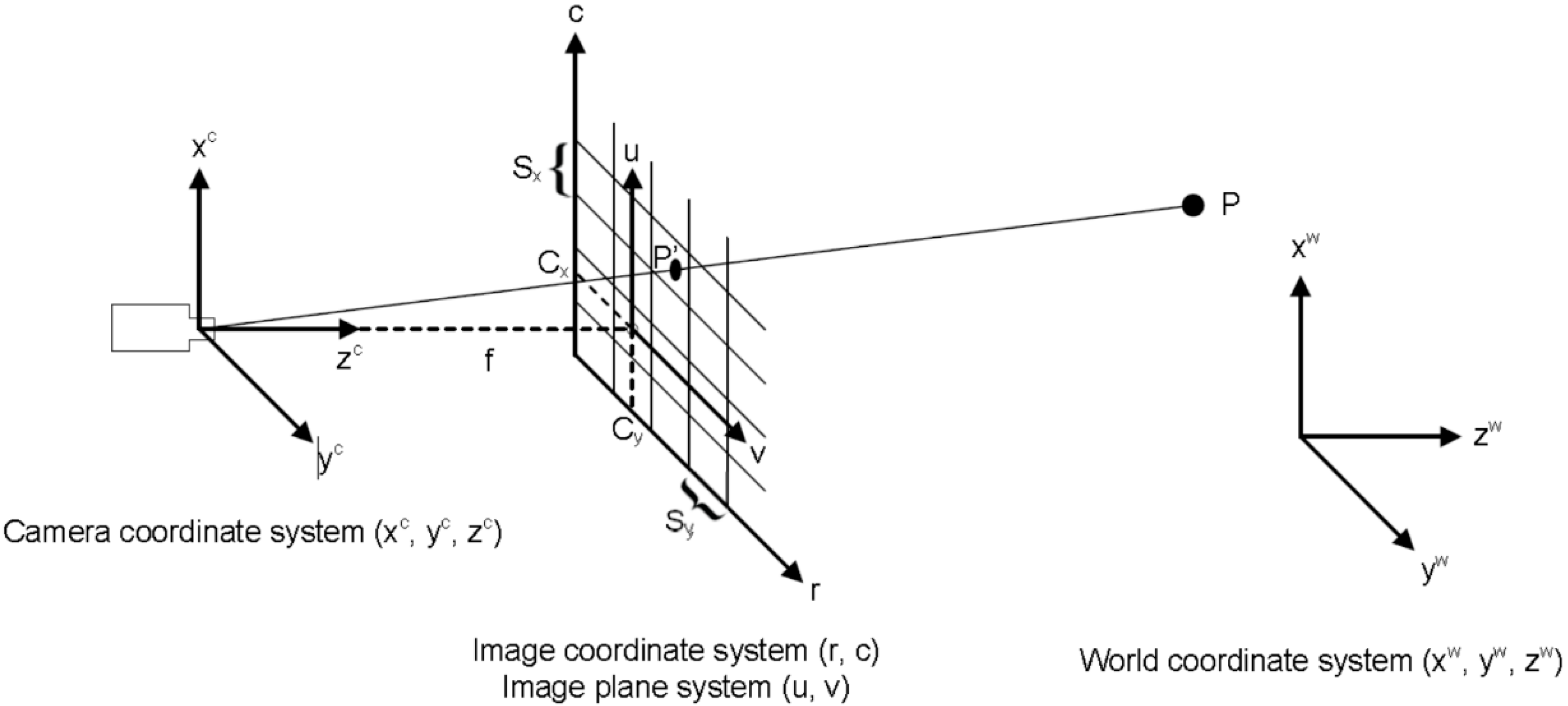 The pinhole model is only an ideal approximation of the real camera projection. Imaging devices introduce a certain amount of nonlinear distortion [24]. Thus, when high accuracy is required, lens distortion must be taken into account [25]. The final step is the transformation from the image plane coordinate system (u, v) to the image coordinate system (r, c), which is the pixel coordinate system. This transformation is achieved using Equation (4), where Sx and Sy are scaling factors that represent the horizontal and vertical distances between the sensor elements on the CCD chip of the camera and the point (Cx, Cy)T, which is the perpendicular projection of the optical center onto the image plane. Equation (4) reflects the calibration matrix: