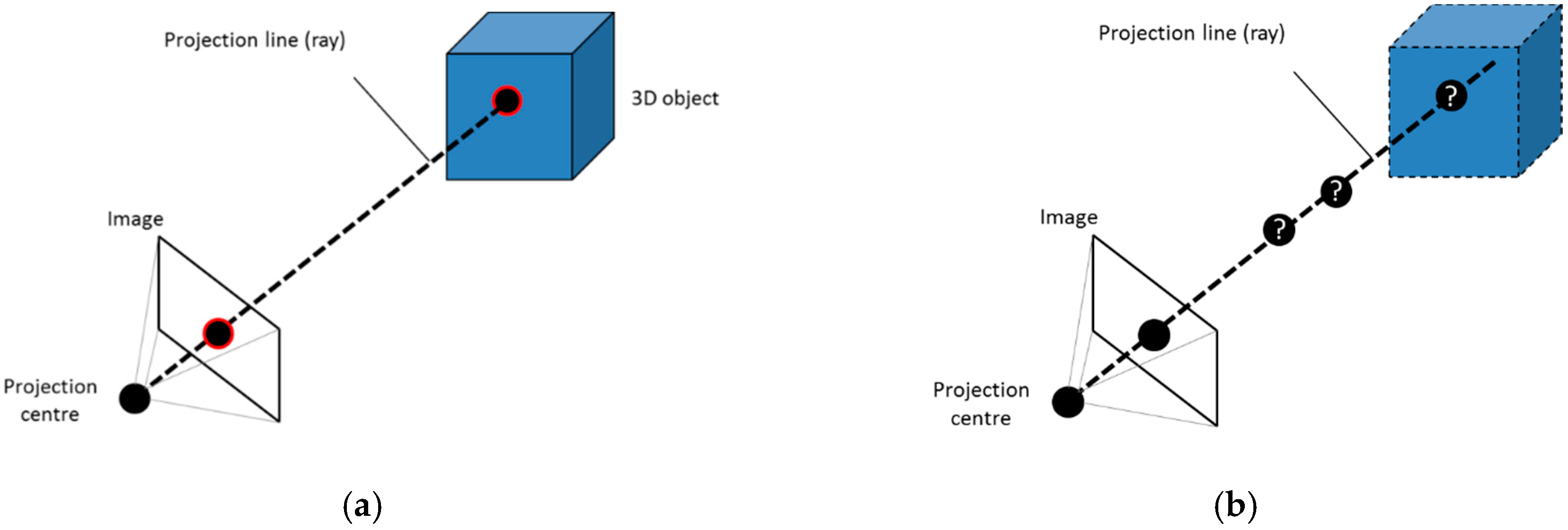 The projection of a point in the scene on the image can be mathematically calculated as shown in Figure 2a. However, given a point of the image it is not possible to obtain directly its original point in the space, as it is not a one-to-one relationship, but one-to-several, thus the inverse problem is ill-defined [26]. In algebraic terms, the projection of a 3D point on the image is not an injective application. Different points can be projected on the same pixel. What is really obtained by solving the inverse problem is a straight line formed by all points that are represented on the same pixel of the image. This is the projection line shown in Figure 2b.