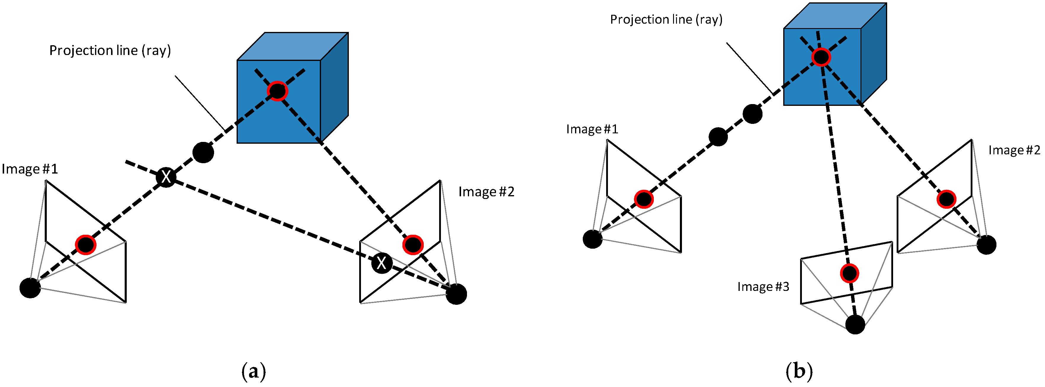 In stereo vision and photogrammetric techniques, the same point has to be found in other image to calculate the intersection of the projection lines and to obtain the 3D position (Figure 3). However, it is recommended that every point could be found at least in three images in order to ensure the detection and to improve the accuracy. The selected points must be the homologous and not any other ones in order to get the right 3D position.