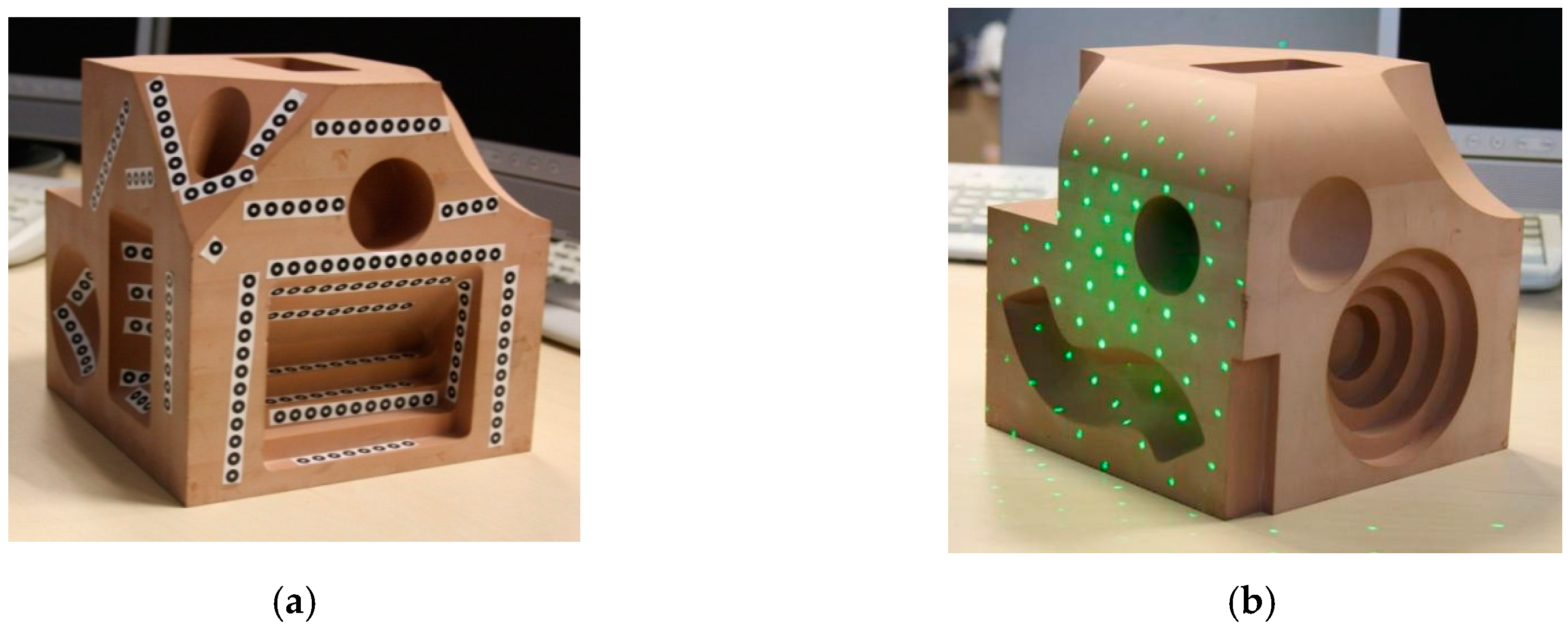 - Bernal, C.; Agustina, B.; Marín, M.M.; Camacho, A.M. Performance evaluation of optical scanner based on blue led structured light. Proc. Eng. 2013, 63, 591–598. [Google Scholar] [CrossRef]