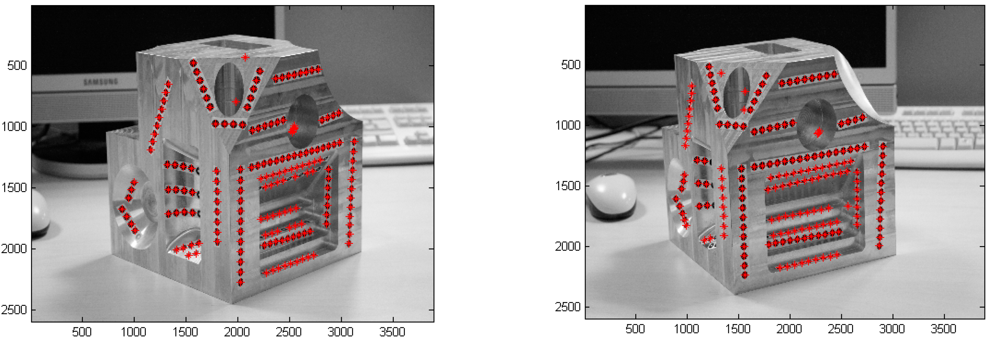 In some cases, it is desirable to avoid these physical marks in order to save time and to automate the process. Feature tracking algorithms find, extract and match intrinsic characteristics of the objects between similar or consecutive images- avoiding physical marks, as can be seen in Figure 6 (markerless stereo vision).