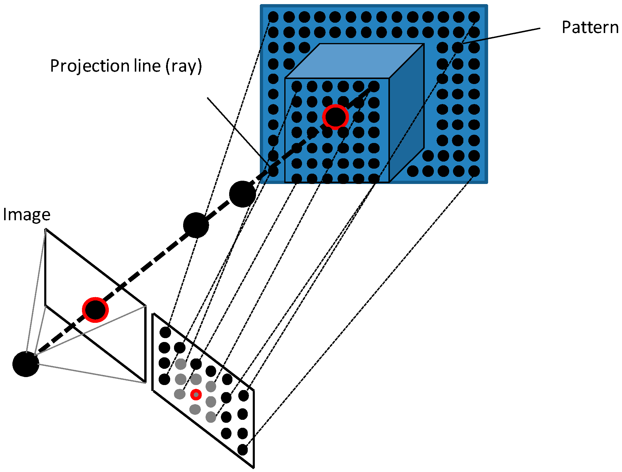The projected texture is usually pulsed infrared light which is not affected by external light sources. It can take many forms including crosses, circles, squares, dot-matrices, multiple lines and random dot matrices. Finding the optimal texture, that is, the one which provides the best correspondence between features of the images, is a complicated problem, influenced by characteristics of the projector, the pattern, and the stereo cameras [49,50].