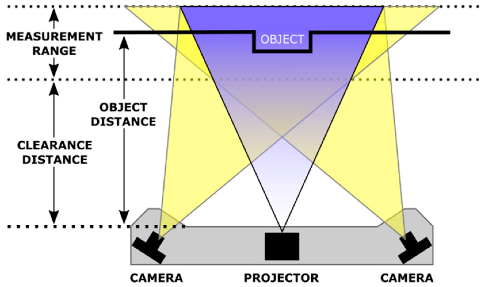 Non-contact 3D digitizing scanners derived from structured light projection are increasingly more accurate, fastest and affordable [56]. Recently, new scanners have been launched based on blue light instead of white. As Figure 9 shows, they use a structured blue LED light module and a stereo scanner to generate the 3D point cloud. The LED module produces high contrast patterns allowing a high resolution scanning of the scenario. It is not affected by external light sources and it is safety for people. Sensors as the HDI 109 and HDI 120 from LMI Technologies can achieve an accuracy of 34 µm and 60 µm, respectively [57].