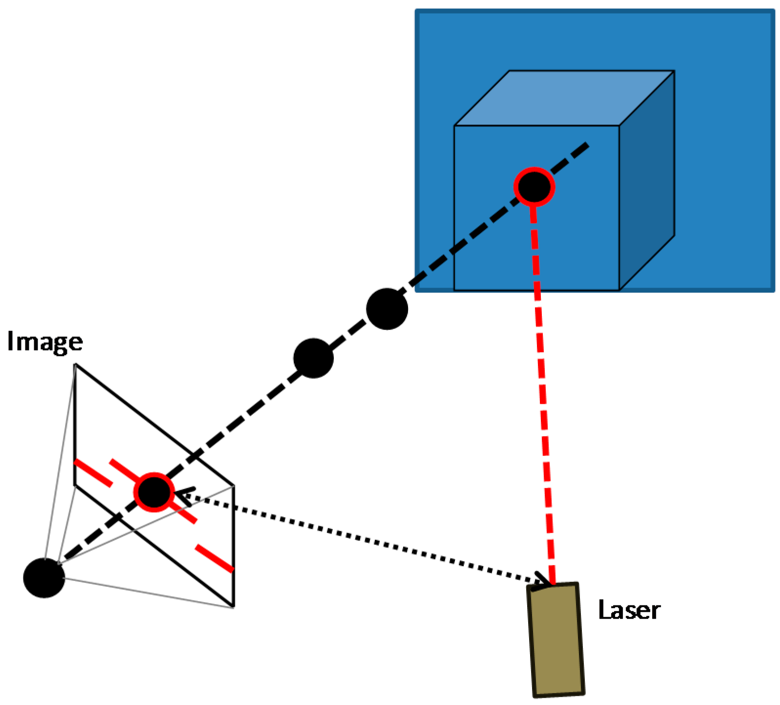 Physical marks, such as stickers or laser points (Figure 4), are necessary over and around the object (the more, the better) and they must be of high contrast in order to ensure the detection. In Figure 5 two images of the same marked part have been taken and processed. The detected marks are printed in red. If the spatial position of the cameras and their calibration parameters are known, the marks can be paired using epipolar geometry and their projection lines and their intersections can be calculated to find the 3D position [40]. Notice that only those marked points are detected and used for the model (marker-based stereo vision).