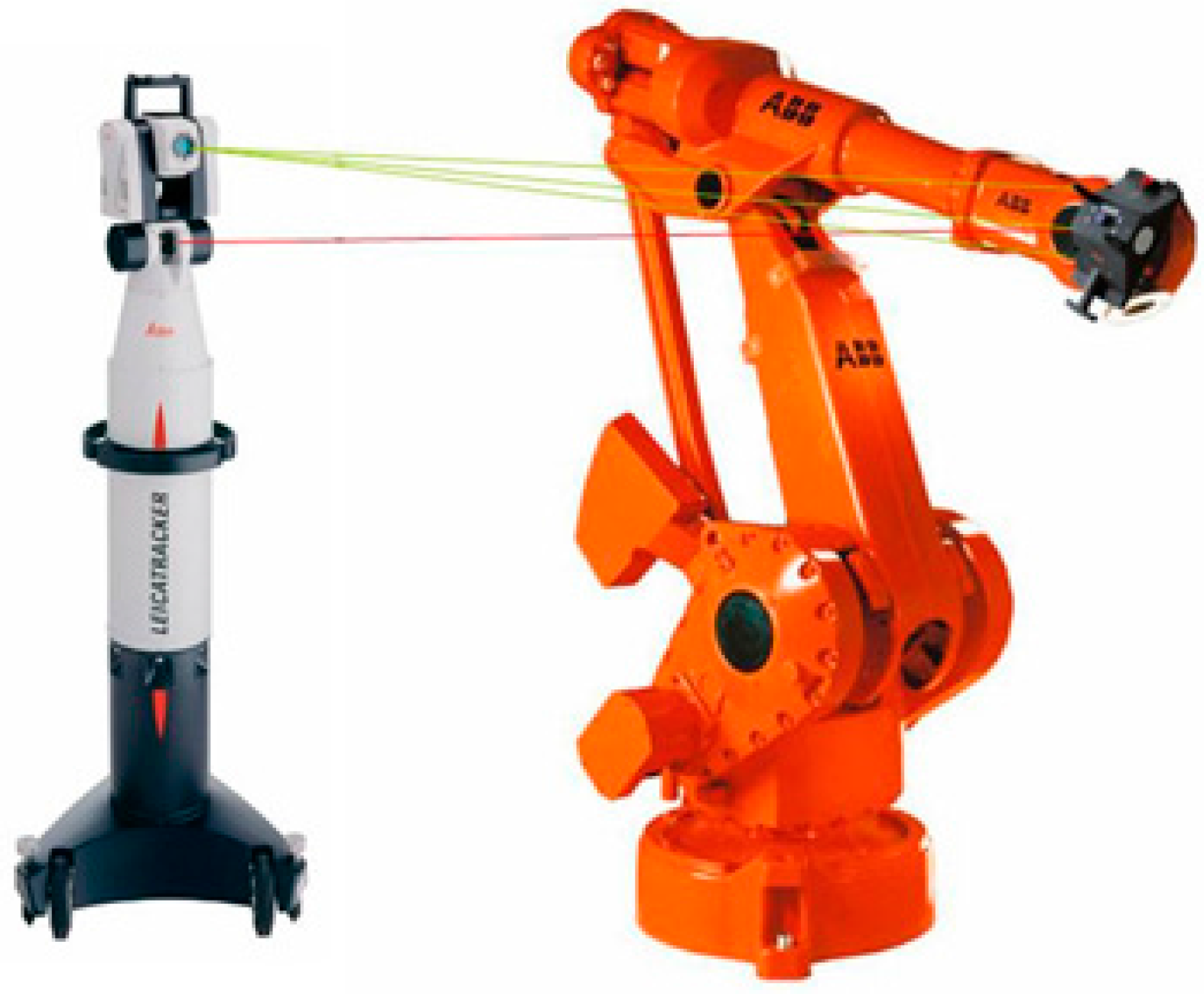 There are several approaches in the literature to determine the position and orientation of a robot's end-effector with high accuracy during arbitrary robot motions based on combined and pure photogrammetric solutions. Laser tracking systems combine laser interferometry and photogrammetry [66,67]. As Figure 13 shows, the end-effector of the robot (the probe) is equipped with a number of LED reference targets suitable for camera imaging, as well as a retro-reflector suitable for laser tracking, all with calibrated local coordinates. The 6-DOF pose of the probe is measured by space resection through a camera that is integrated into the laser tracker. Distance information is provided by interferometric laser ranging while the camera measures angular information of the probe [68]. Laser trackers are also used to identify the geometric and dynamic parameters of the robot in order to improve the accuracy of the model, increasing thus the accuracy of the robot [69]. Qu [70] presents a laser tracker application to reduce the relative pose error of the robot of an aircraft assembly drilling process to less than 0.2 mm.